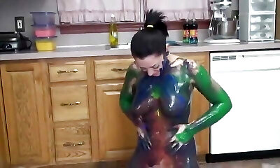 Horny slut strips off underwear and gets filthy on floor with assets paints