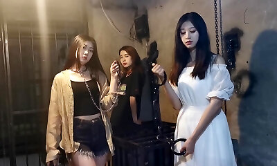 трио азиатских девушек сдерживают бондаж