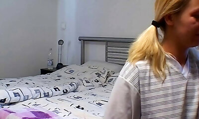 стройная коротко стриженная блондинка сжимает в кулаках своего покорного худощавого парня и доит его большой член, пока он не кончает