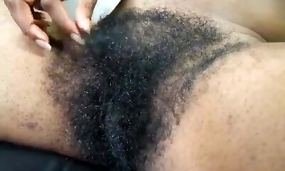 Perverted Asian jack her hairy pussy while her man fucks her in anal