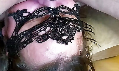 Tied up light haired blinded chick with puffy nipples is mouth drilled