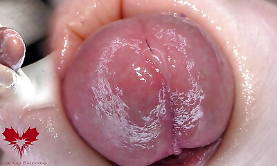 Super close-up of the dick head. Urethral games with the dilator.