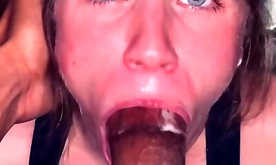 Blue-spotted submissive maintains eye contact while sucking BBC tip