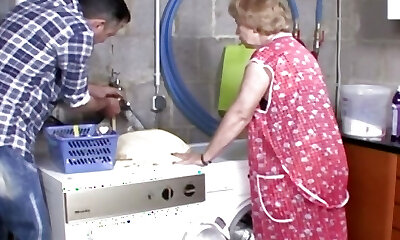 Very old ash-blonde granny pleases two workers